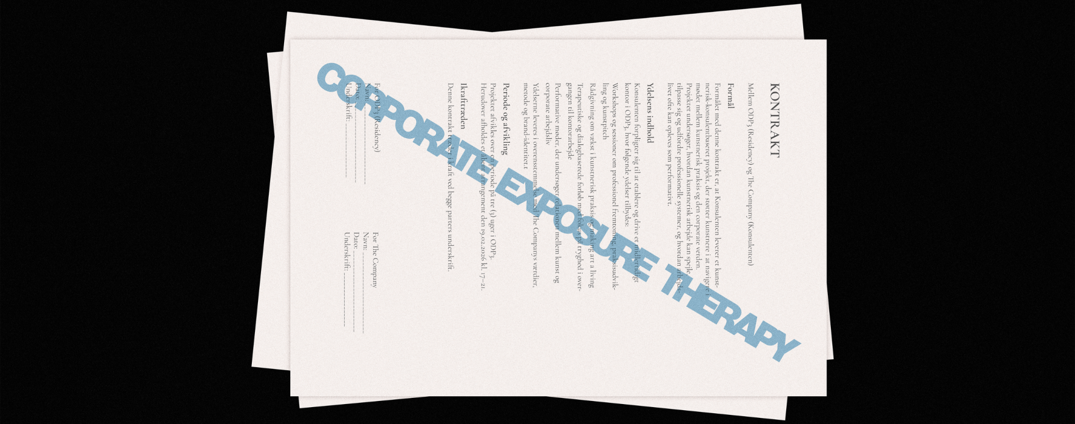 Corporate Exposure Therapy er en simulation af de arbejdsstrukturer, vi uundgåeligt er en del af, og en undersøgelse af hvad der sker, når man forsøger at passe ind i systemer, som man samtidig er kritisk overfor. Vi undersøger, om kunstnerisk praksis vurderes, måles og iscenesættes på samme vilkår/måde som andre jobs/brancher, og hvad der sker, når man forsøger at passe ind i systemer, som man samtidig er kritisk overfor.